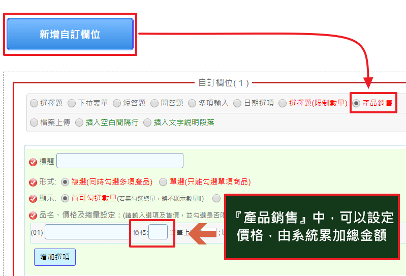 這個收款計算方式,會直接對應到活動設定時的步驟二:表單設定時的新增自訂欄位『產品銷售』。