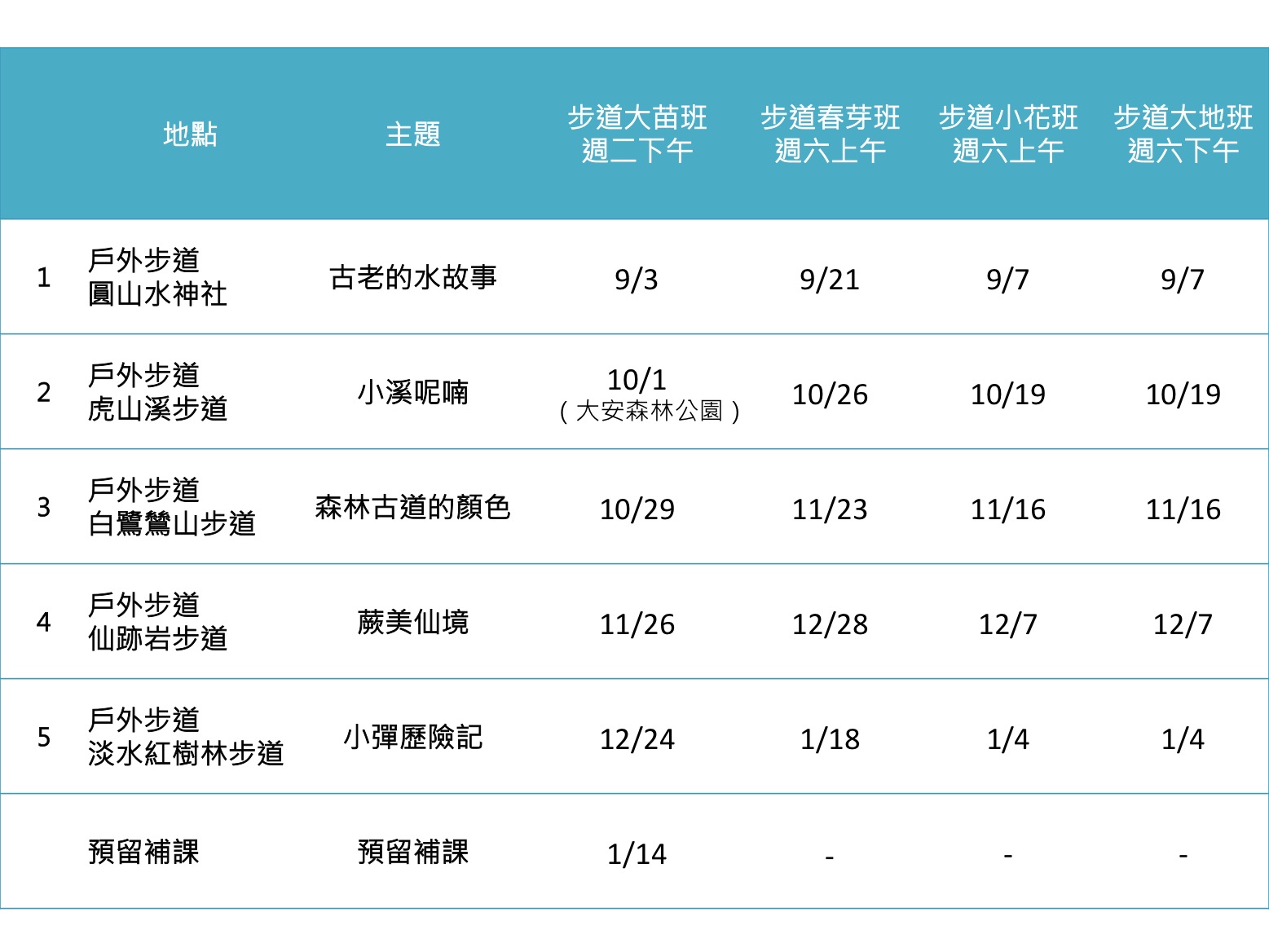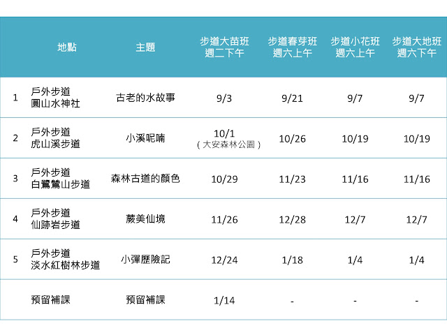 *在森林的路上挑選之步道地點,皆盡量挑選大眾運輸可到達之地點且適合學齡前幼兒之安全的近郊步道,本學期的地點部分較遠離捷運站,需再轉乘公車,報名時請納入考量・實際執行地點,將可能因當時步道狀況調整成其他替代地點・