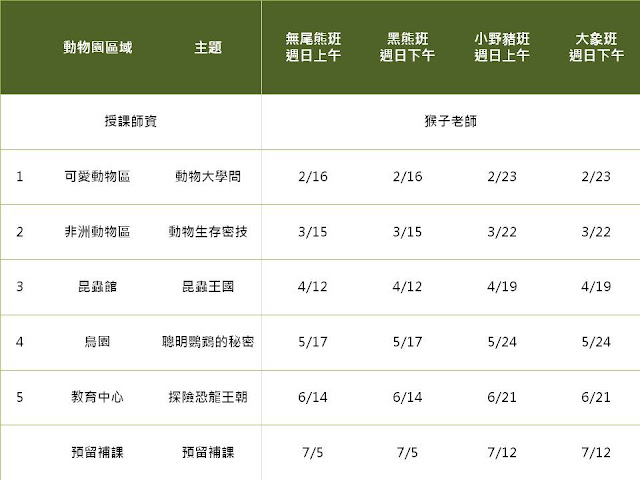 動物園每月班2500元/整期5堂(含講師鐘點、講義、保險、教具材料費用)