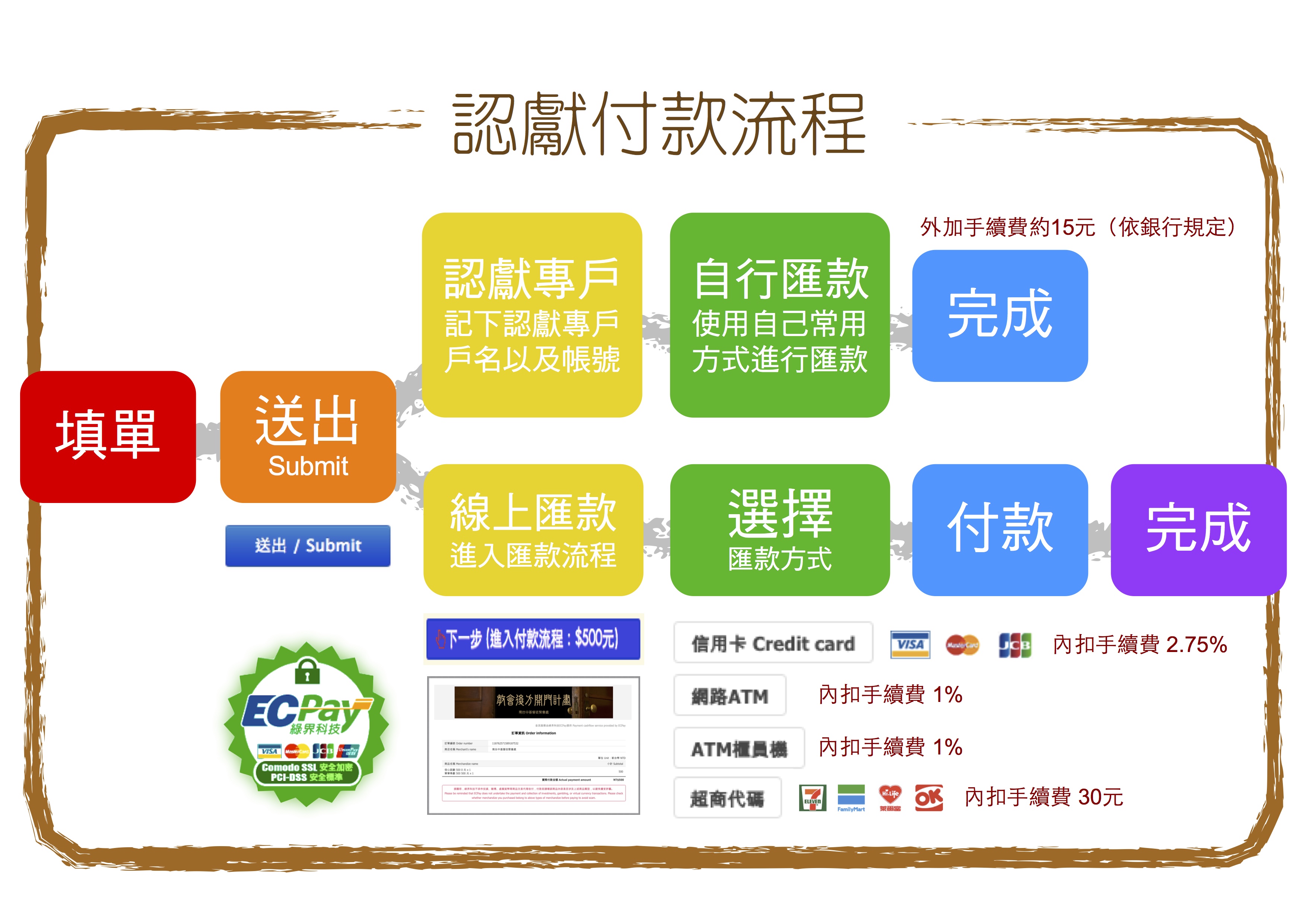 經由「綠界科技」線上轉帳系統,採手續費內扣機制,依您所選擇的匯款方式計算其手續費,方式詳列如下:|國內信用卡 2.75%|國外信用卡 3.5%|ATM轉帳 1%|超商代碼 30元| |