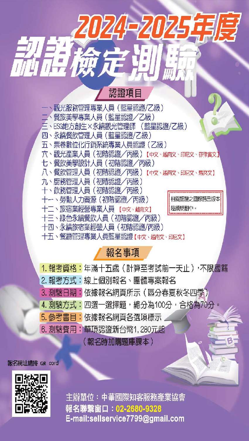 E:『觀光服務管理專業人員認證』,本認證包括觀光旅遊服務、旅行社、海洋觀光、休閒產業、旅宿業、餐飲服務管理....等相關業界服務管理面向。四選一選擇題 共100題,總分為 100 分,合格為 70 分。