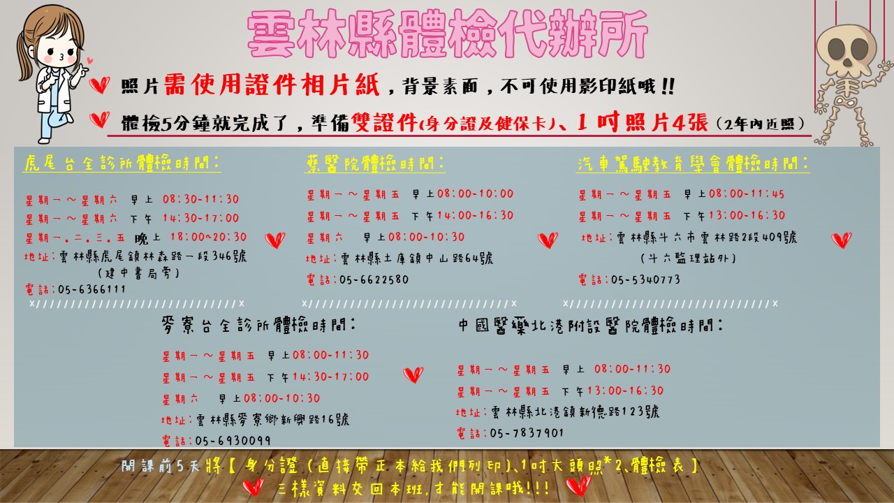 (體檢資料包含:體檢表、1吋照片*2、身分證)