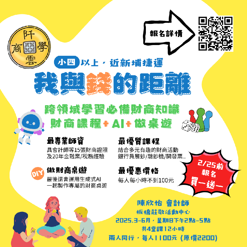 ✅ 兩人同行,一人免費!(揪朋友一起學,親子共學,每人每小時不到$100!)✅ 贈送每位學員 $1000 財商課程折價券!(下次課程折抵,讓學習更超值!)✅ 可加購「玩桌遊3小時」,只要$100!(邊玩邊學,讓財商變有趣!)✅ 親手製作 DIY 財商桌遊!(課後還能繼續玩,學習效果加倍!)