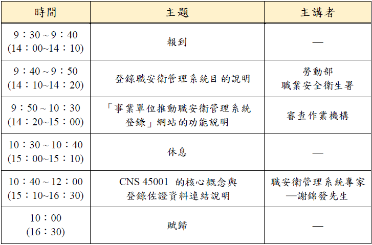 (二)為掌握事業單位推動職業安全衛生管理系統現況,勞動部職業安全衛生署將上開應建置職業安全衛生管理系統,且尚無通過「臺灣職業安全衛生管理系統(TOSHMS)」之事業單位列為查核對象,應至指定網站登錄上傳職業安全衛生管理系統相關推動資料。為使各界了解登錄事項與操作方式,特辦理本次說明會議,說明應登錄項目、需檢附的佐證資料與操作方式等,並邀請專家解析CNS 45001核心概念與登錄項目之關聯性,協助事業單位透過登錄機制,更加掌握職安衛管理系統的推動重點與方向。