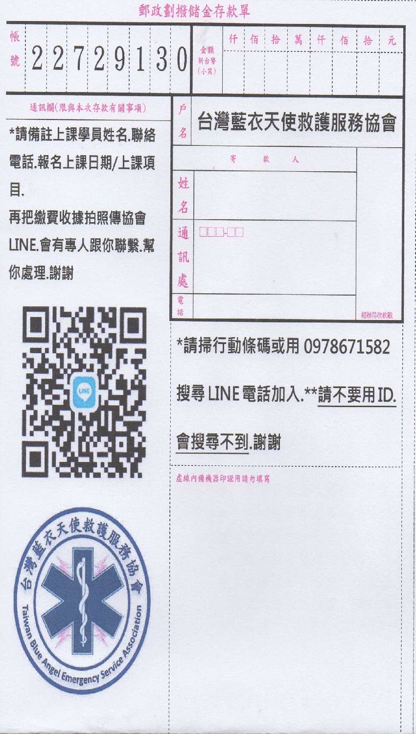 ATM轉帳戶名:台灣藍衣天使救護服務協會