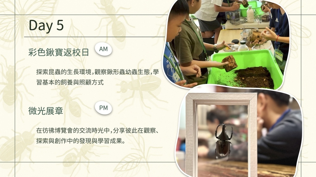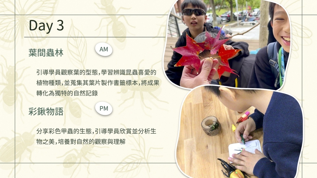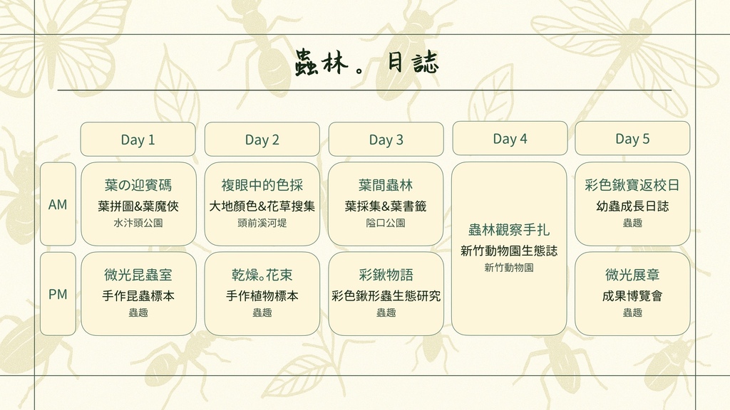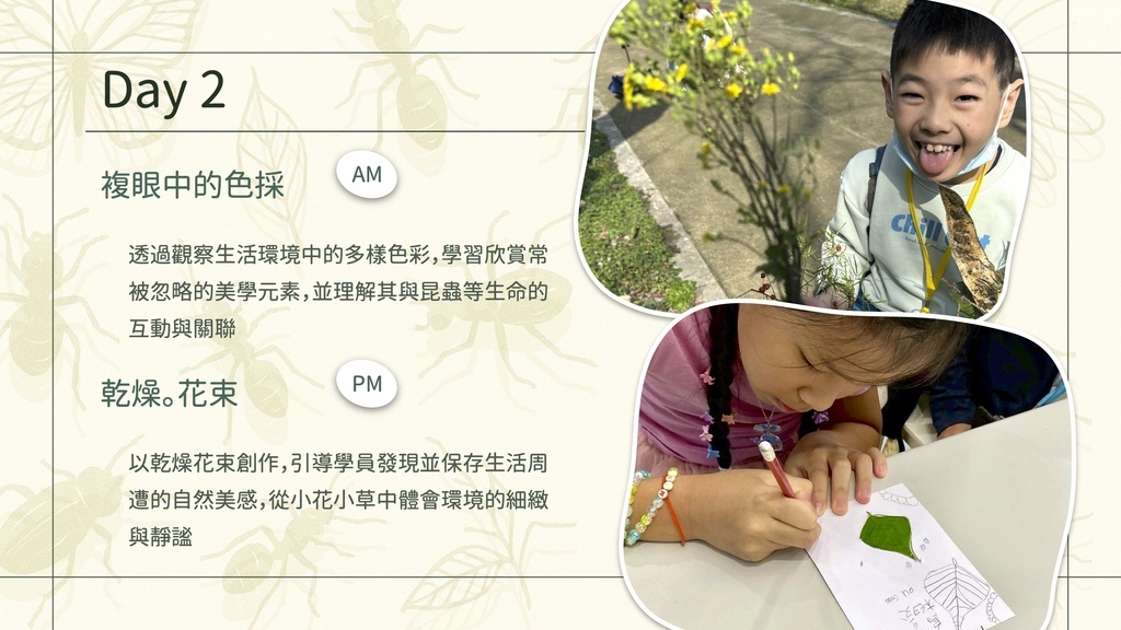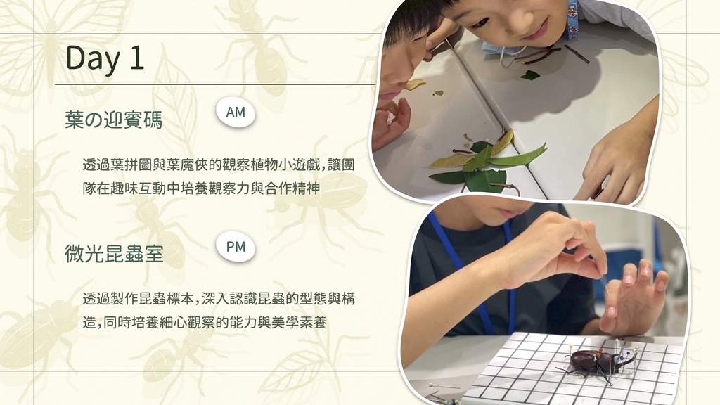 在生態在這個充滿美之驚豔的冬季生態蒐藏營隊中,孩子們將走進城市綠地,置身於戶外自然氛圍,化身小小自然收藏家,探索生態野地的奧秘。透過昆蟲標本、花束製作、葉子觀察等活動,培養觀察力與環境關懷。親手蒐集、分類與記錄,用心感受自然的美好與四季的轉變,一起留下冬日最珍貴的記憶!