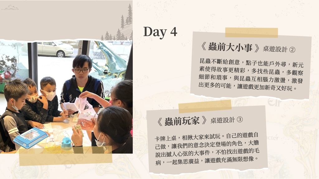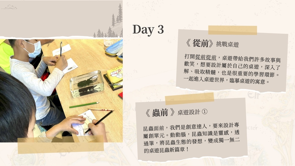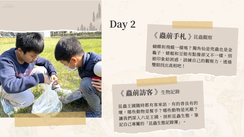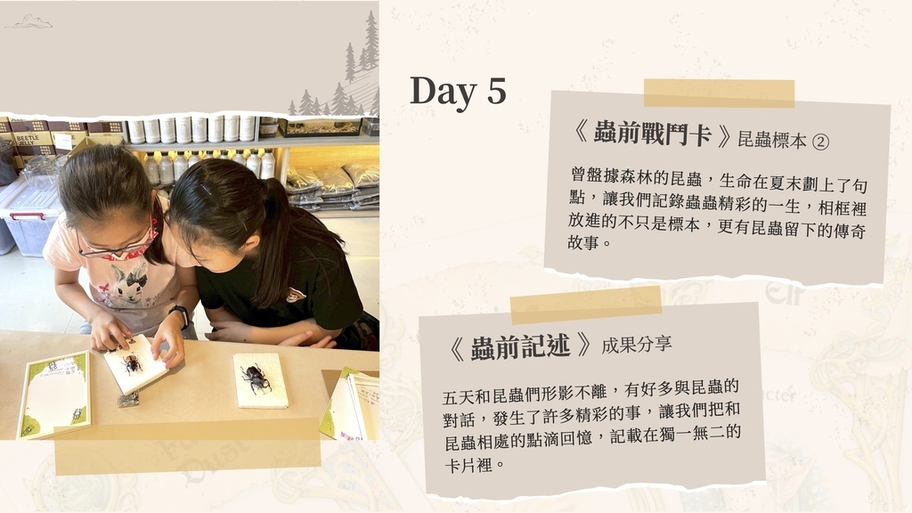 横持戈矛,身著戰甲,大兜蟲威風凛凛傲視著屬於牠的森林,然而,稱霸王國不是一件容易的事,挑戰者前仆後繼與之爭鬥,更有天敵躲在暗處,虎視眈眈隨時取而代之。爭鬥不過是甲蟲生活的冰山一角,更多的是昆蟲與大自然暖心互助的劇情,讓我們深入昆蟲國度,徵選故事角色,將記錄繪製成卡片,讓觀察變成一篇精彩的甲蟲故事!