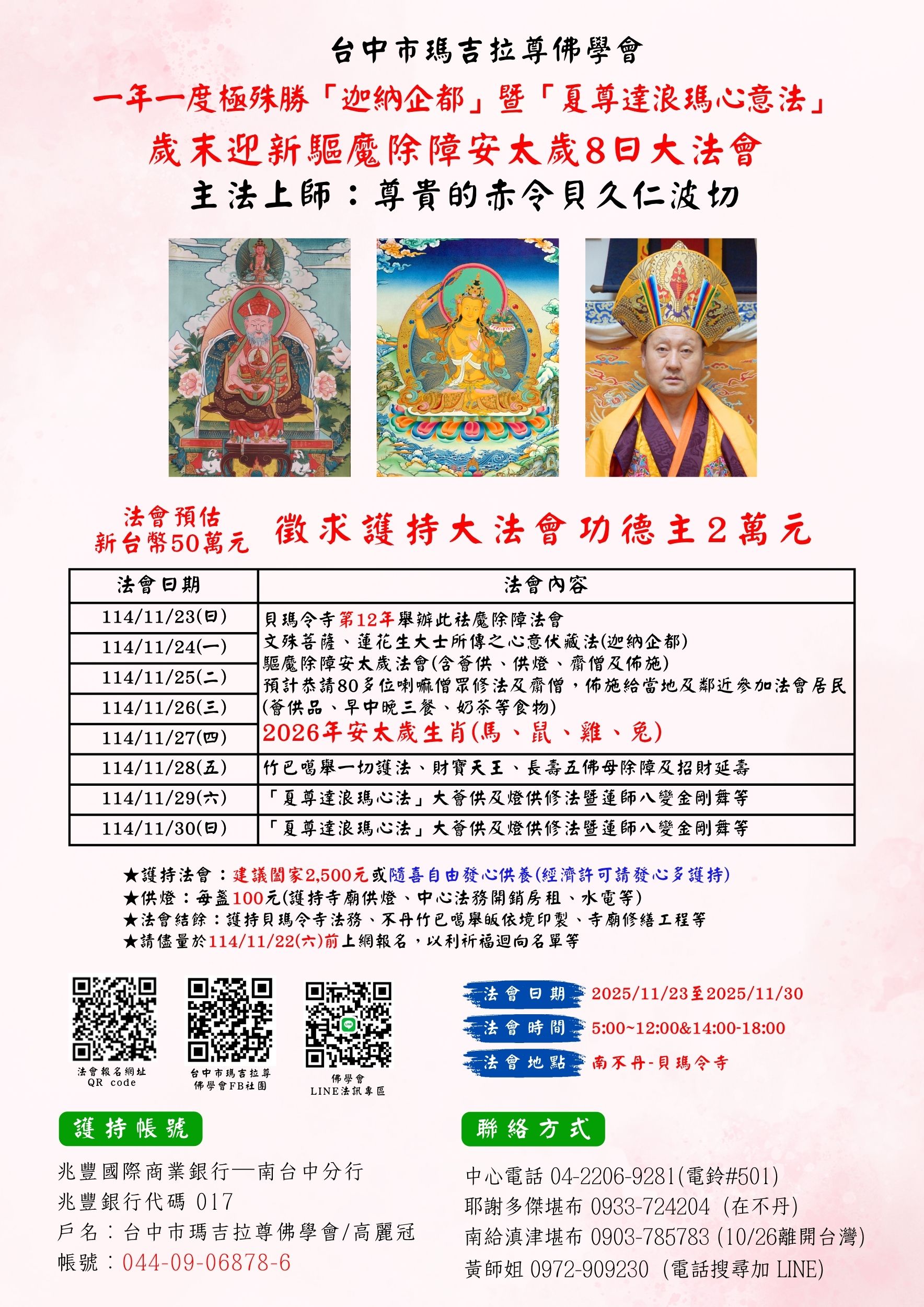 薈供、燈供、齋僧及佈施 歲末迎新袪魔除障安太歲法會