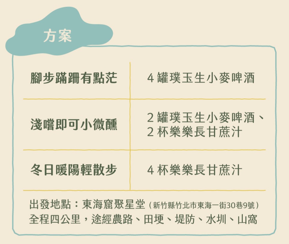 淺嚐即可小微醺 600元/人(兩罐璞玉生小麥啤酒、兩份樂樂長甘蔗汁、托特包疊色絹印)