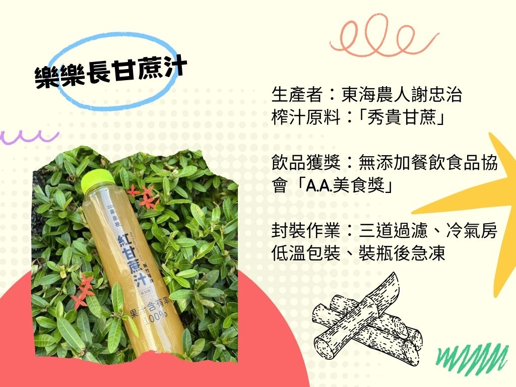 散步飲料:樂樂長甘蔗汁(250ML/杯),為「樂樂長」選用台灣紅甘蔗冷壓製成