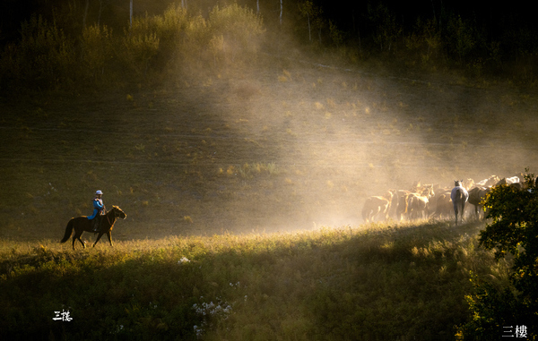 拍攝將軍泡子日出下的水中奔馬→小紅子山水面中波光粼粼的馬奔澗水與倒影→楊樹背光影下的白樺林→駱駝隊光影。
