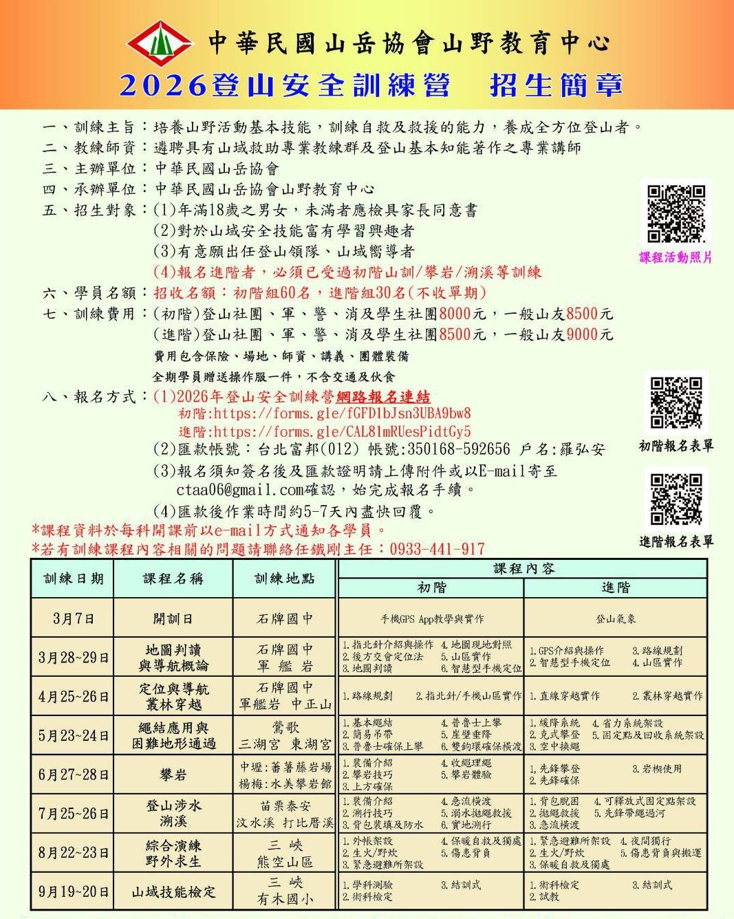 中華山岳山野教育中心,多年來舉辦登山安訓練營,並培育出百位各有所長的專業教練。