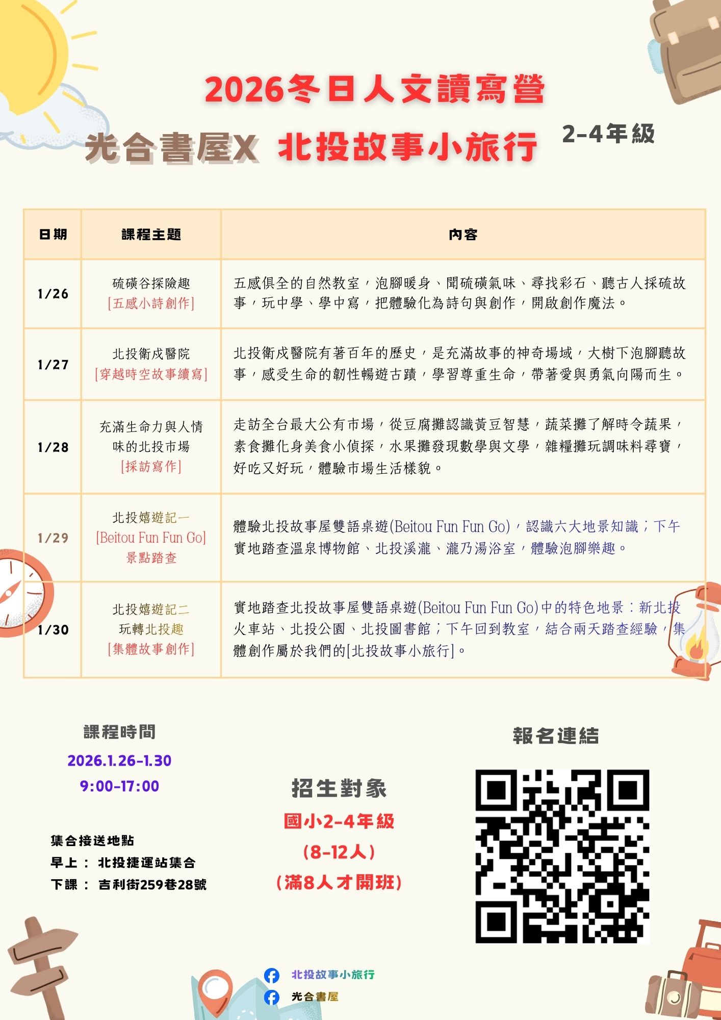 冬天,最適合漫遊北投溫泉鄉的季節!跟著老師們的腳步,一起用五感去感受北投的故事與溫度。我們從[硫磺谷]開始,泡腳體驗冬日溫泉的熱氣,勇敢挑戰[女巫火山湯]的獨特氣味,親手探索火山地形的神奇力量。走進[北投衛戍醫院],在古樹下泡腳,聆聽庇護志工們分享勇氣與關懷的故事。[北投市場]裡,我們一起變成美食小偵探,從豆腐到蔬菜、水果攤,學習生活的智慧與人情味。透過[雙語桌遊和踏查],老師們陪你認識北投的地景與歷史,最後用創作把這段旅程深深烙印在心中。這不只是課程,更是陪伴孩子們學習尊重生命、感受文化與土地的溫暖時光。