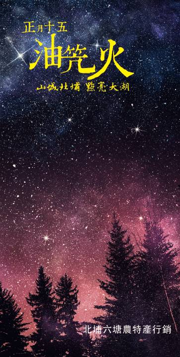 大湖村擁有美麗的自然景觀,和豐富的生態資源,活動不僅只有晚上,白天還可以先到北埔大湖村的六塘來一趟輕旅行,製作自己的專屬火把,體驗專屬北埔的節慶與文化另外安排手作體驗課程,還幫大家準備北埔在地特色小吃餐盒(內有一口菜包 彭家粄糕 游記餅舖 隆源餅店 名店特色產品)