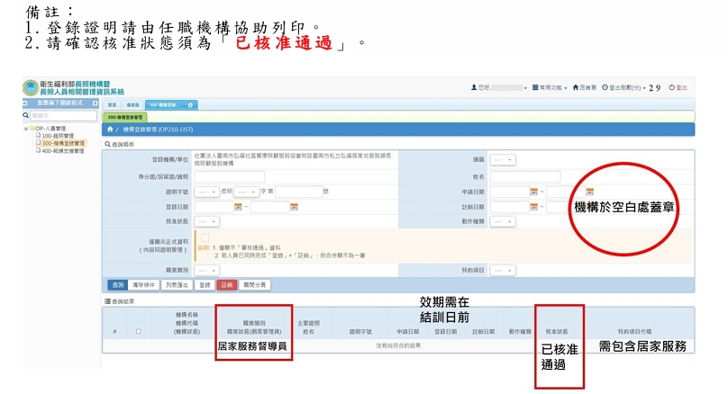 2. 登錄證明操作步驟:長照機構暨長照人員管理資訊系統→OP人員管理→300機構登錄管理查詢您的實際登錄情形,截圖列印畫面→蓋機構大小章→掃描上傳至報名系統。