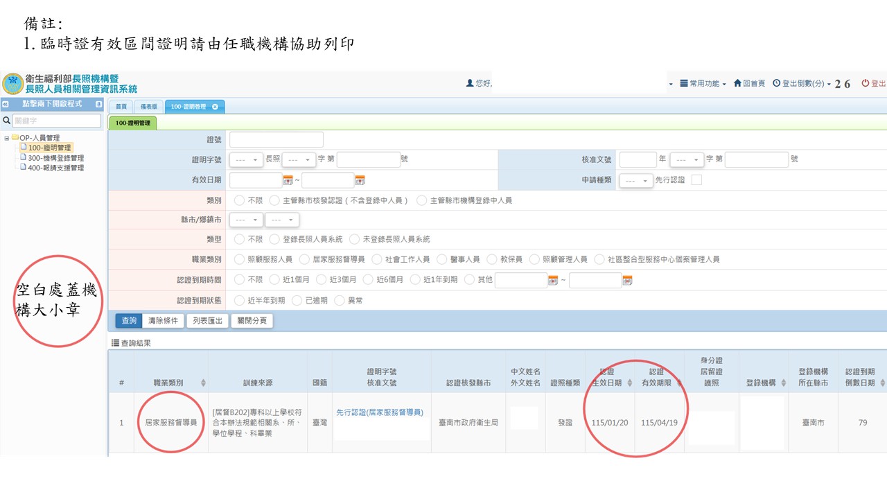 3. 臨時證有效區間(效期)操作步驟:長照機構暨長照人員管理資訊系統→OP人員管理→100證明管理查詢您的臨時證有效區間,截圖列印畫面→蓋機構大小章→掃描上傳至報名系統。