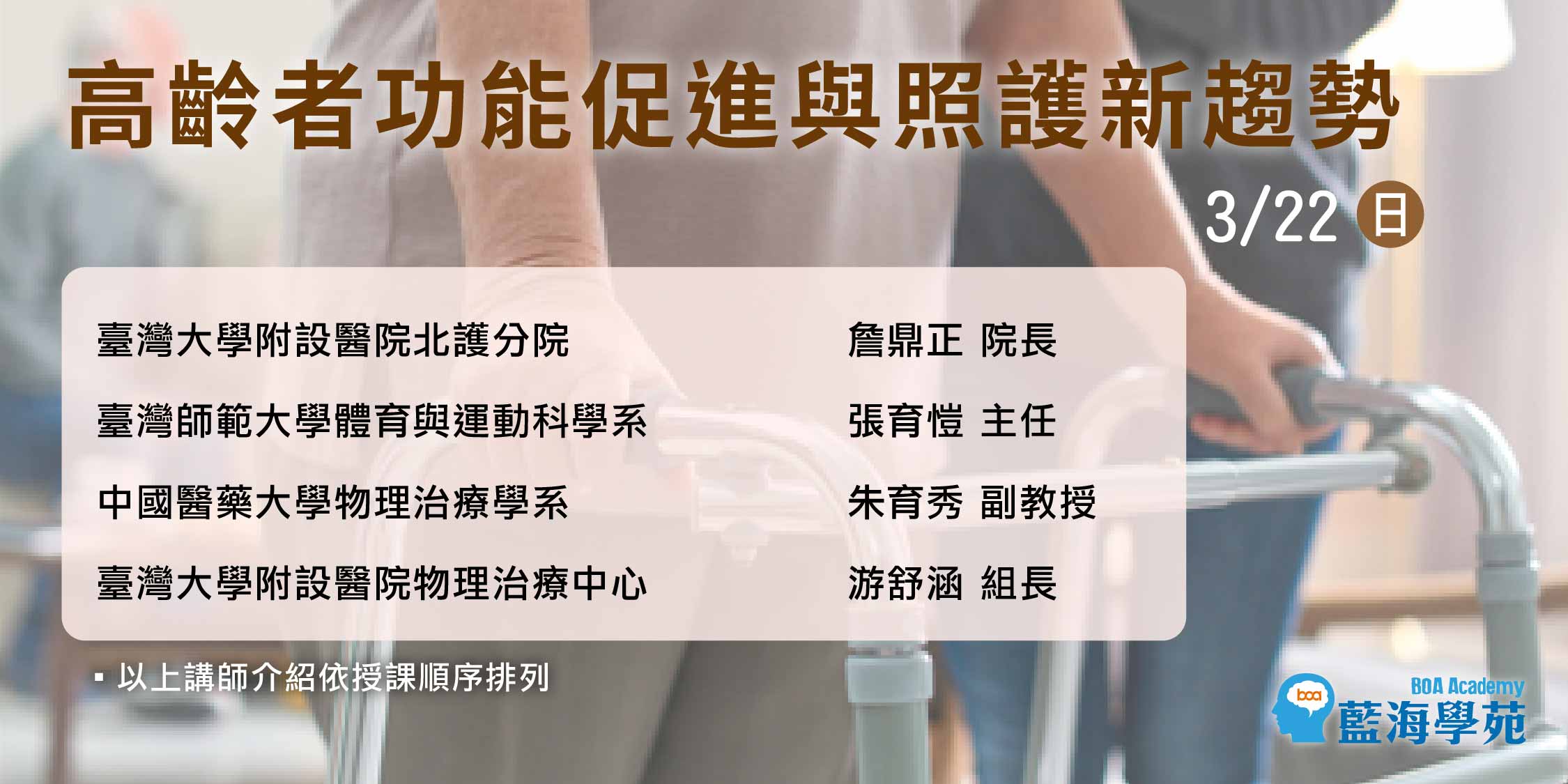 本課程由多位專精於高齡健康照護的專業人員,分享於老化機制、運動認知科學、失智症照護與高齡防跌的研究成果與臨床經驗,透過系統化的理論架構,理解功能問題的成因,作為後續介入與照護決策的重要基礎。