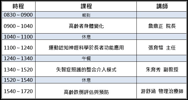 本次課程上午邀請 國立臺灣大學醫學院附設醫院北護分院 詹鼎正院長,從高齡者身體結構、神經系統與功能退化切入,協助醫療專業與長照人員,深入瞭解老化過程中結構與功能改變的整合,並進一步連結臨床與照護常見的功能受限、動作代償與風險。同時結合 國立臺灣師範大學體育與運動科學系 張育愷主任 分享之運動認知神經科學觀點,探討高齡者在動作學習、注意力參與、認知介入與神經可塑性等方面之特性,說明如何運用任務導向訓練與適當的運動設計,提升高齡者的功能表現、自主能力與生活參與度,並有效降低因代償所造成的二次傷害與功能惡化風險。