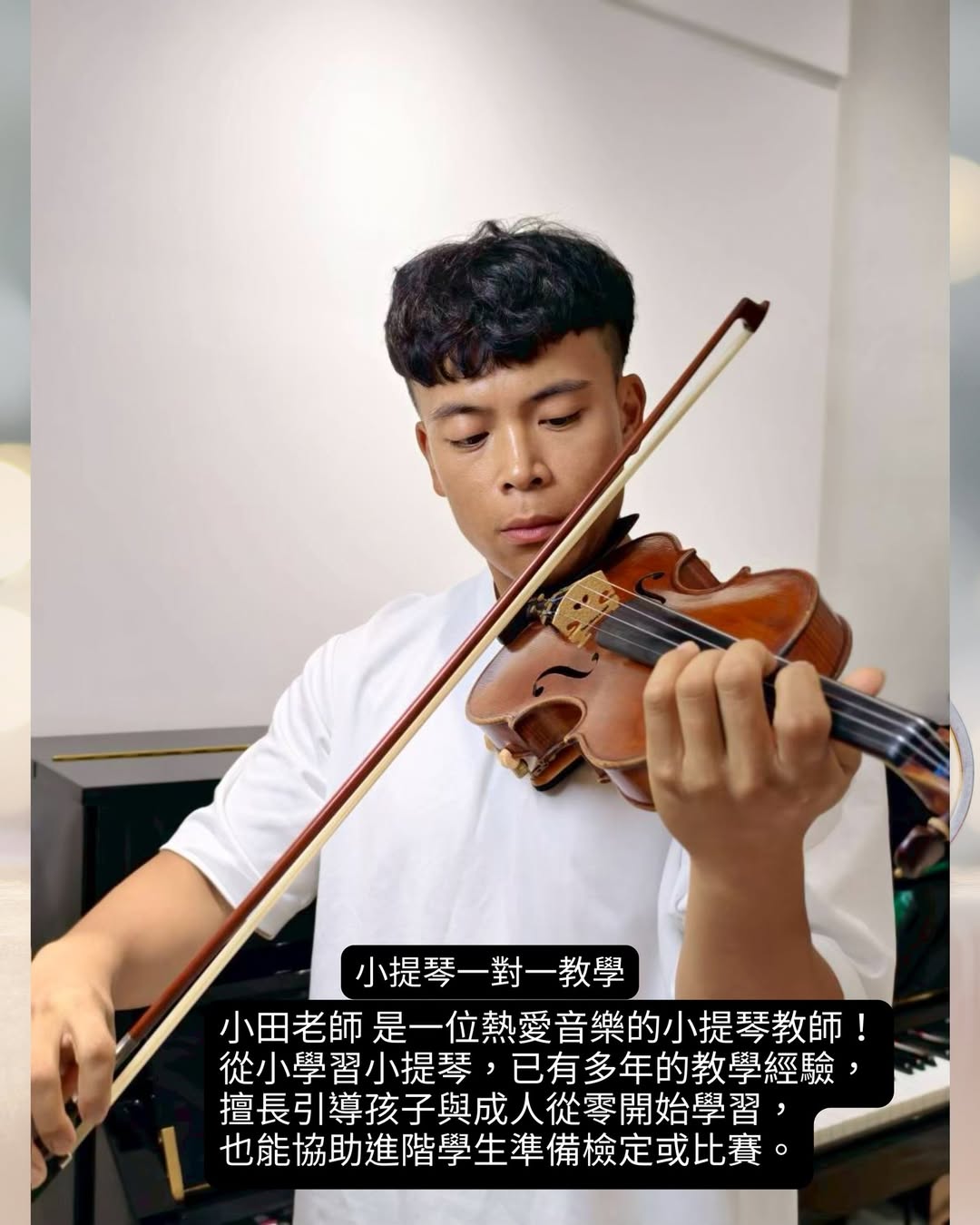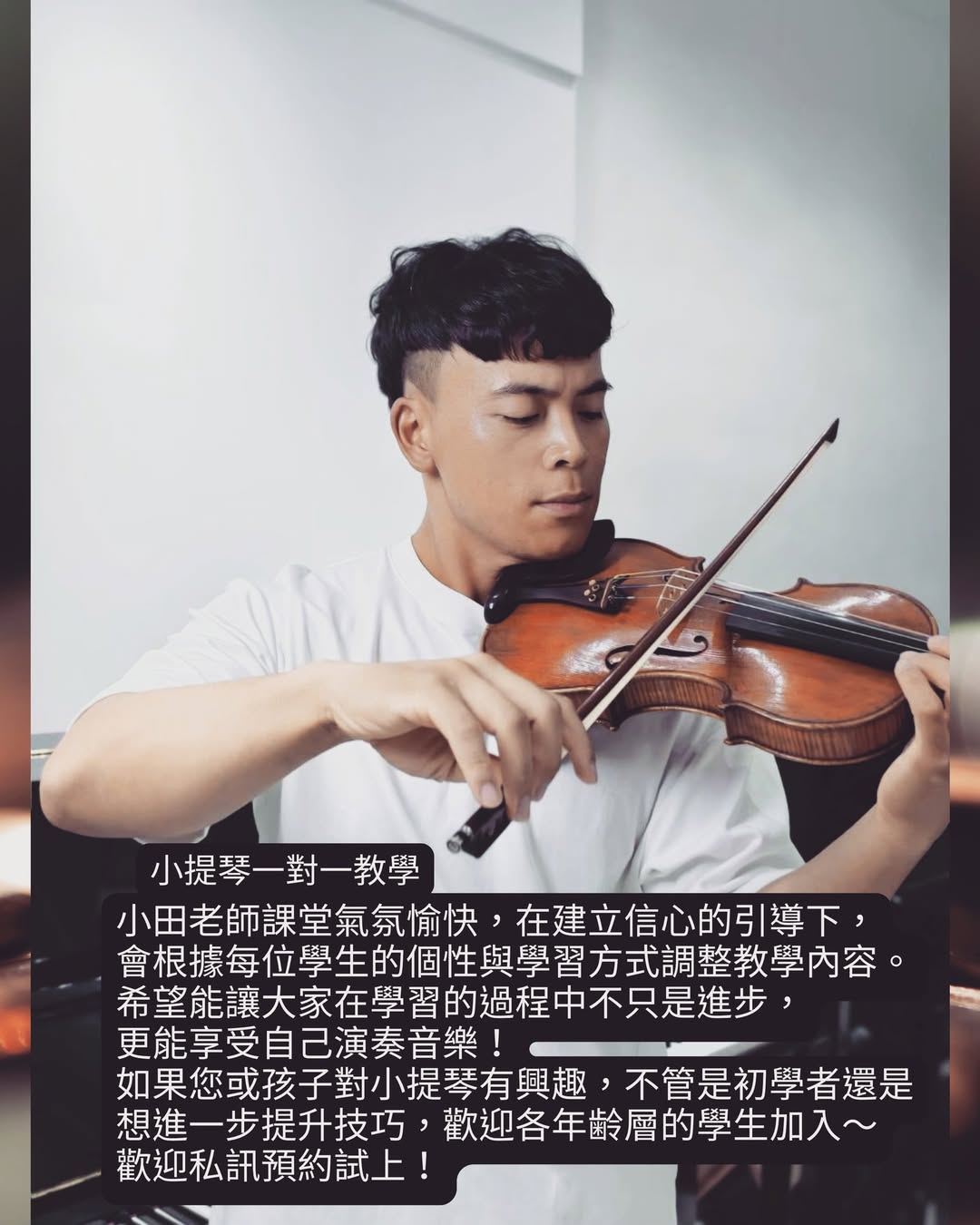 小田老師 是一位熱愛音樂的小提琴教師!從小學習小提琴,已有多年的教學經驗,擅長引導孩子與成人從零開始學習,也能協助進階學生準備檢定或比賽。小田老師課堂氣氛愉快,在建立信心的引導下,會根據每位學生的個性與學習方式調整教學內容。希望能讓大家在學習的過程中不只是進步,更能享受自己演奏音樂!