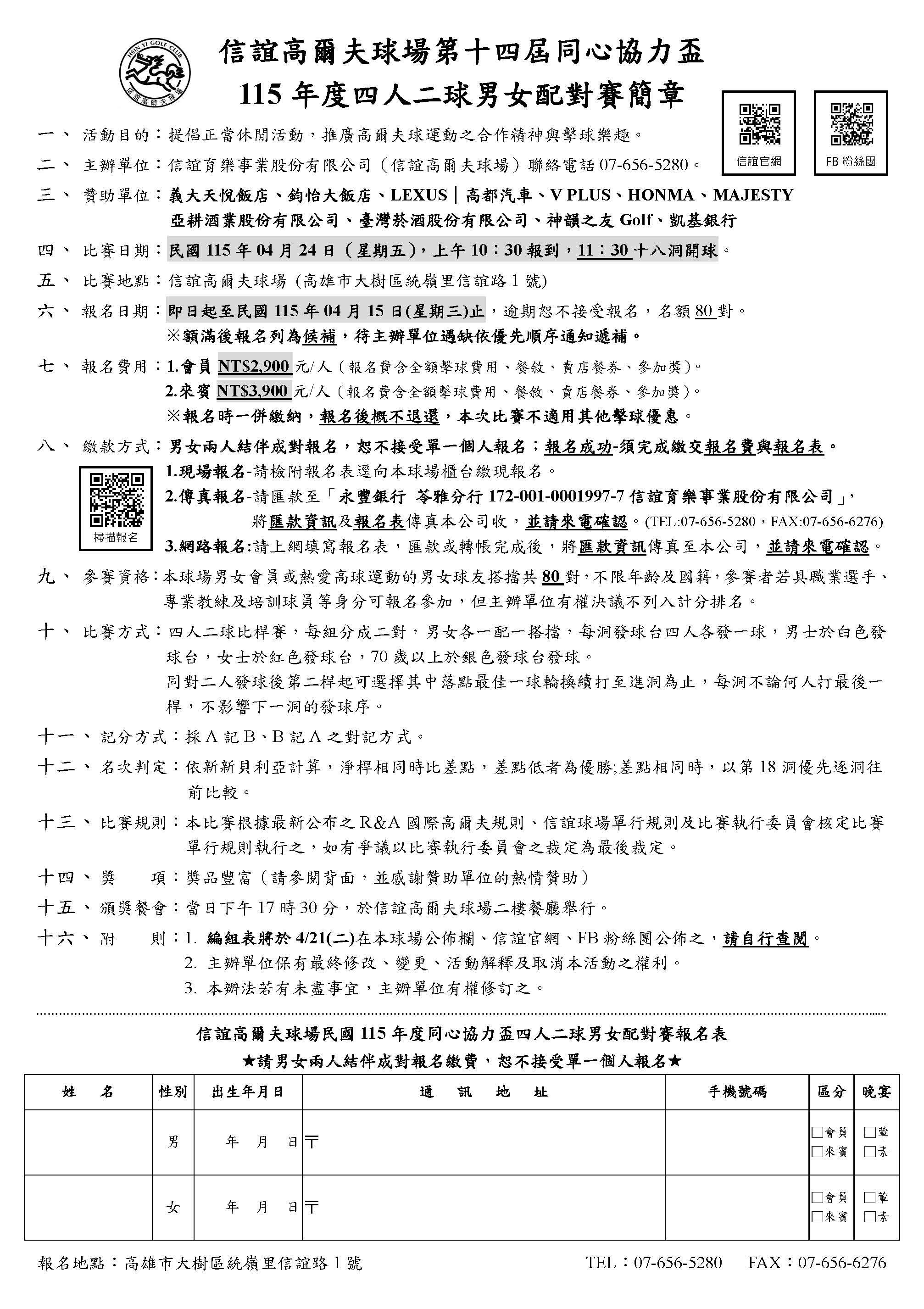 民國115年04月24日(星期五),上午10:30報到,11:30十八洞開球。