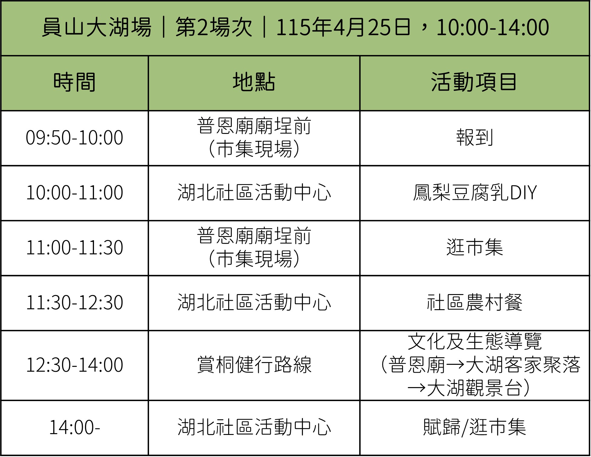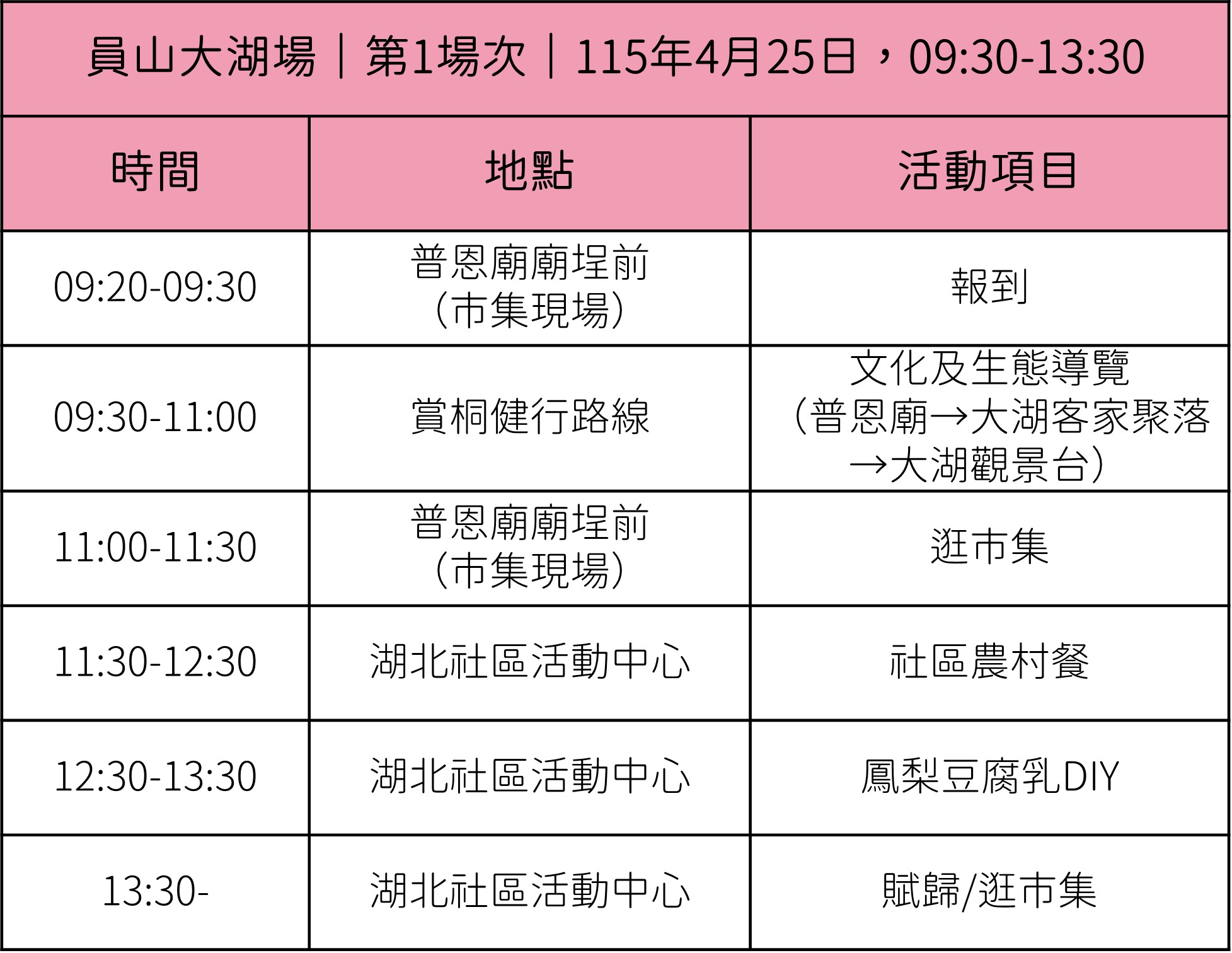 客庄生活導讀、大湖水系認識、桐花生態解說、品嚐客家風味餐、鳳梨豆腐乳DIY。