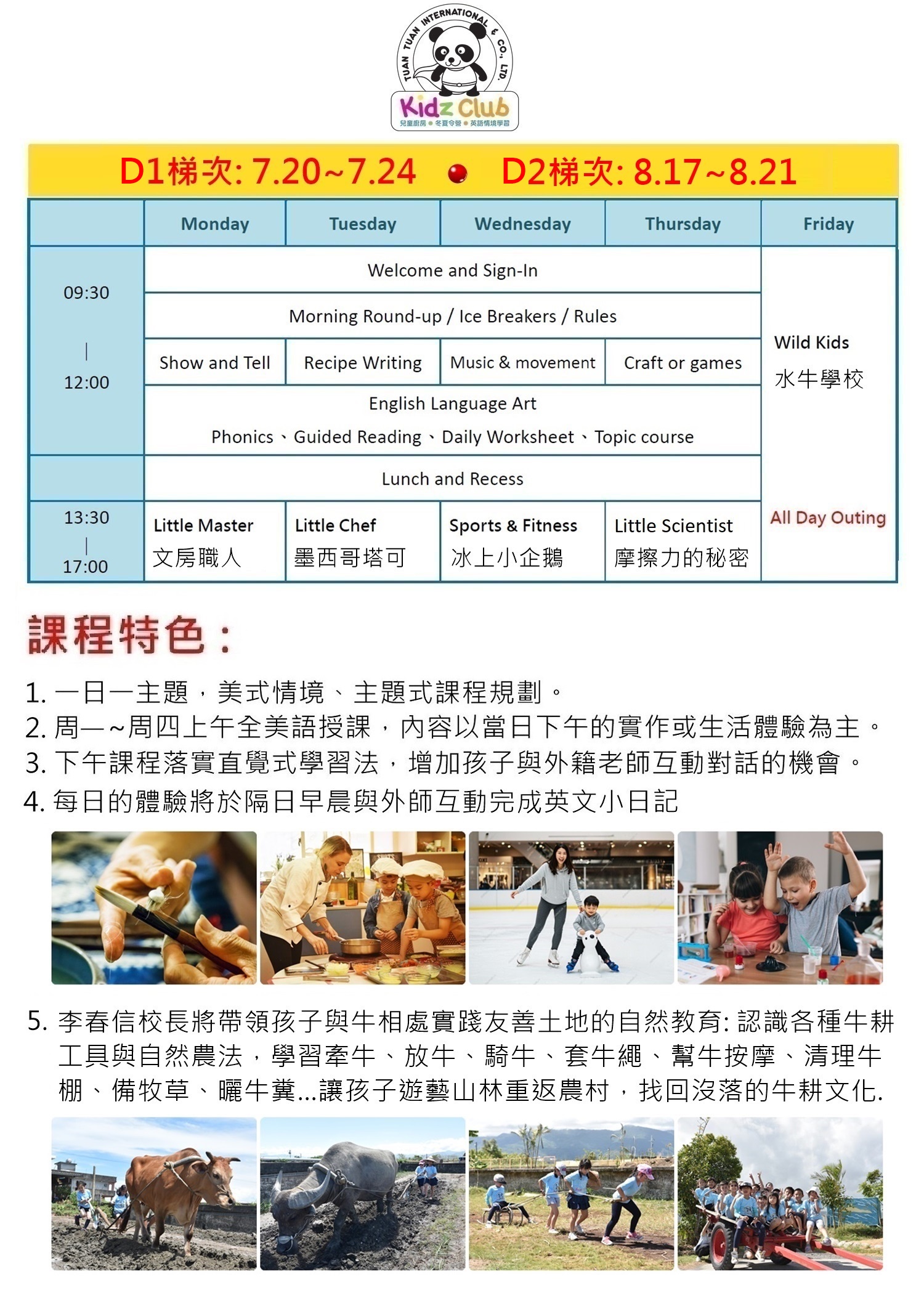 如此設計的目的就是為了讓充滿樂趣的假期活動結合英語教學帶領孩子打開耳朵、張開眼睛、刺激五感....引發自主學習的能力。