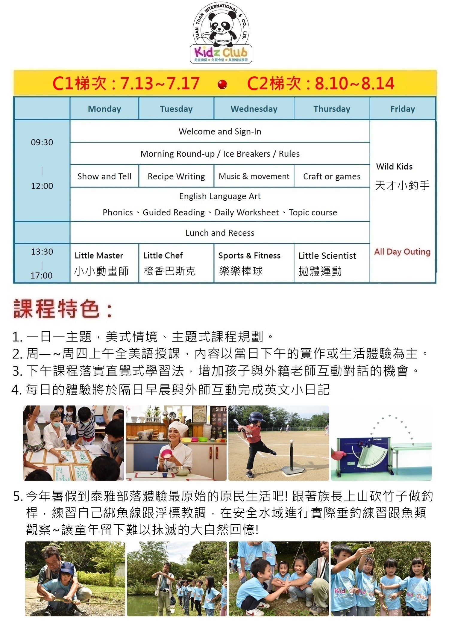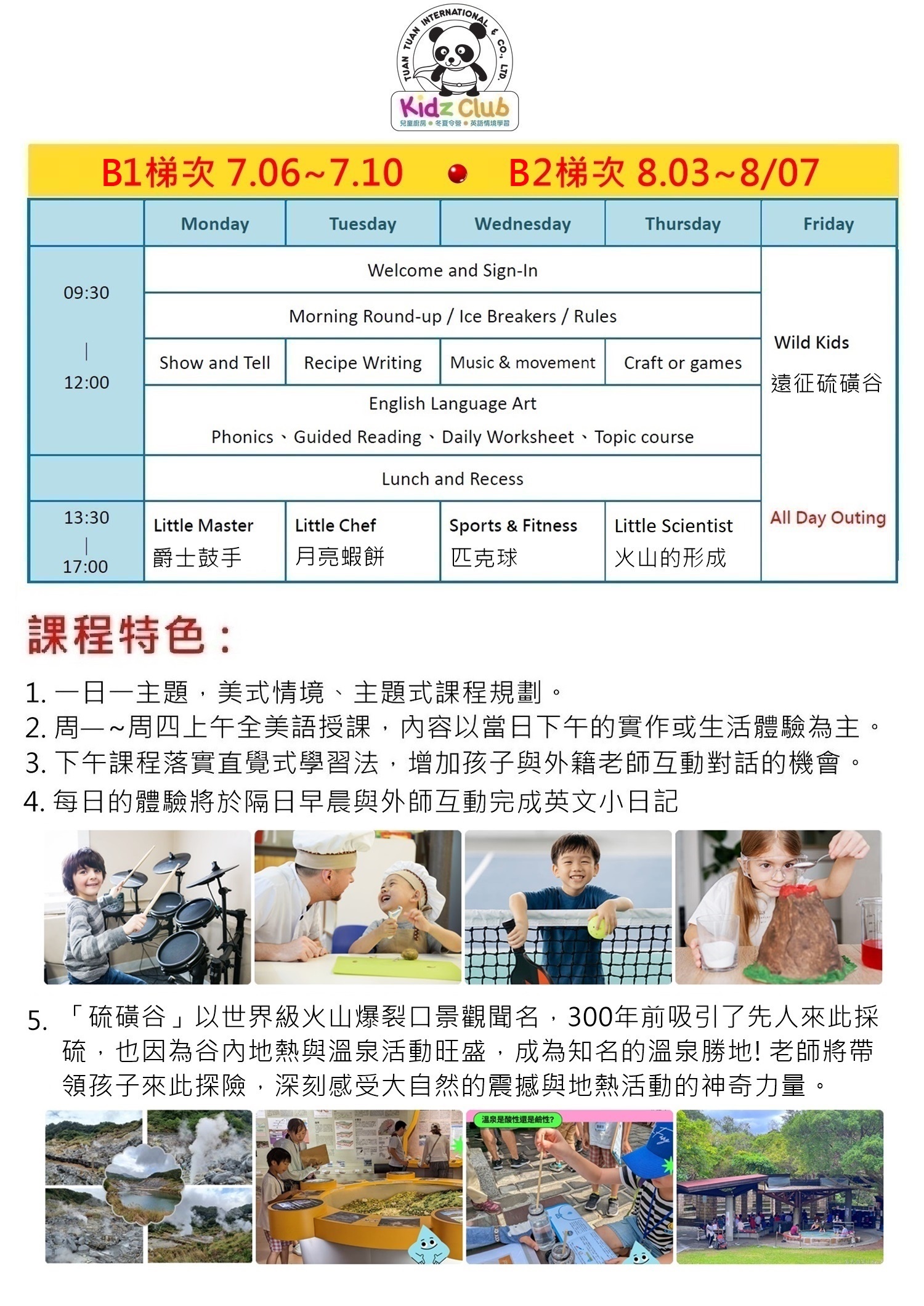 Kidz Club 的課程特色就是將室內與戶外課程交替進行,全美語課程以當日進行的室內或戶外活動為主題,創造全美語情境並落實直覺式學習法,增加孩子與外籍老師互動對話的機會。