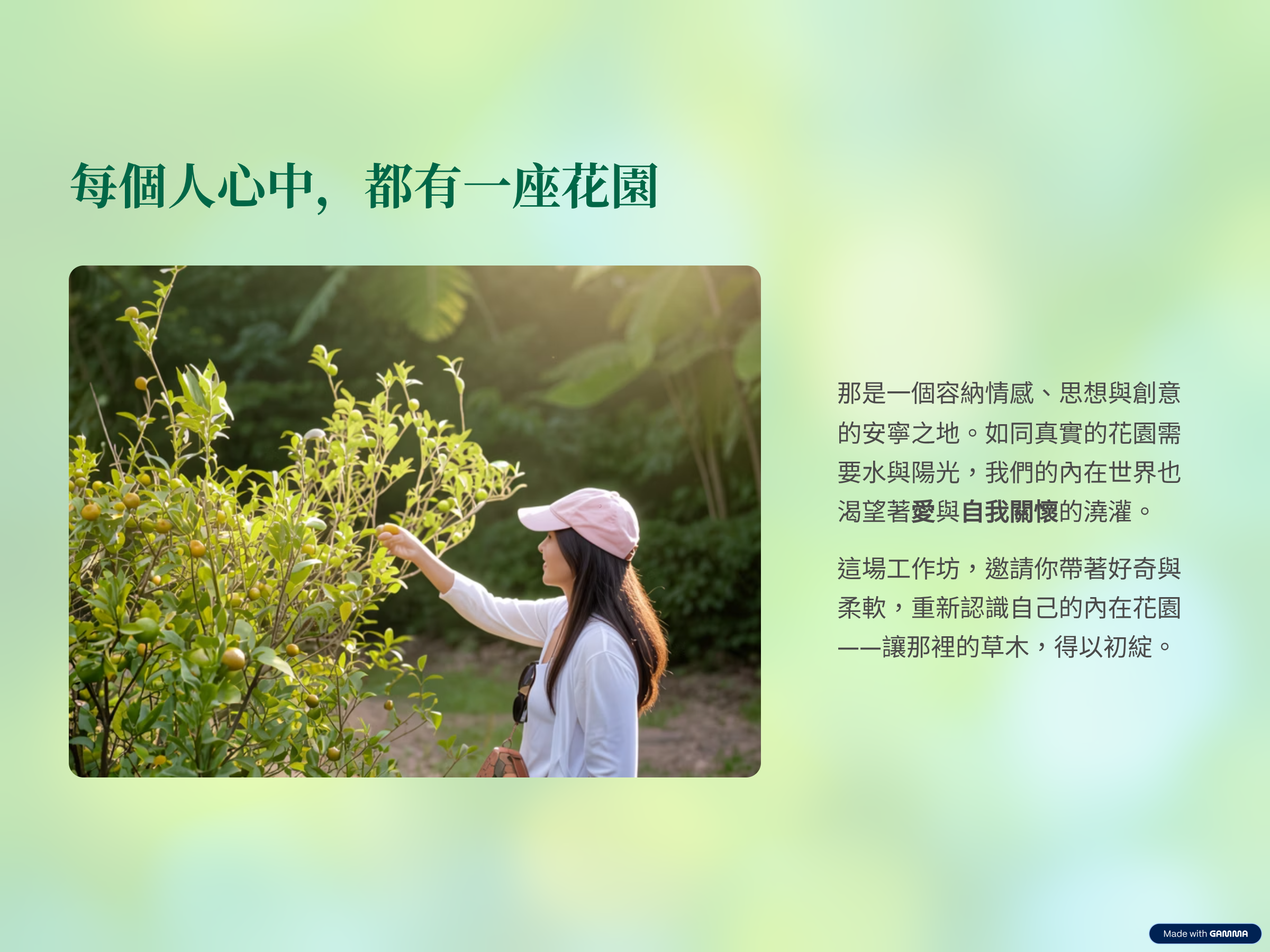 每個人的心中都擁有一座內在花園,那是一個容納情感、思想與創意的安寧之地。如同真實的花園需要水、陽光和悉心照料,我們的內在世界也渴望著 愛 與 自我關懷 的澆灌。
