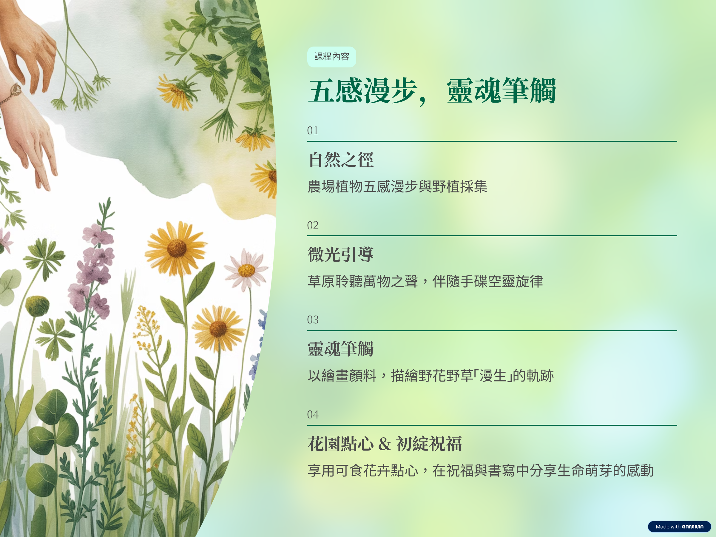 我們將目光投向那些在角落安靜生長的野花與野草,她們不為取悅誰而生,只是順應天時,自在地「漫生」。透過觀察這些堅韌的生命,我們將看見自己內在正要「初綻」的勇氣與美感。並運用繪畫媒材,描繪出這片內在花園。