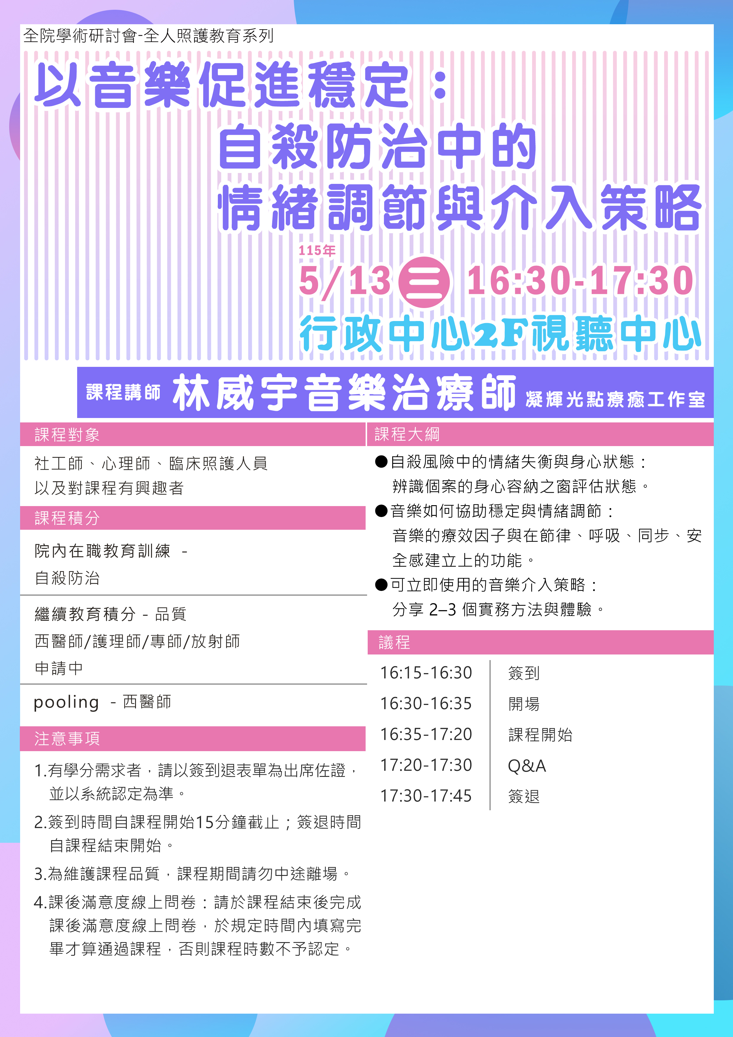 3. 有醫事人員有學分需求者,請以研討會現場簽到退表單為出席佐證,並於研討會結束後一週內填寫線上課後滿意度問卷,填寫完畢才算通過。
