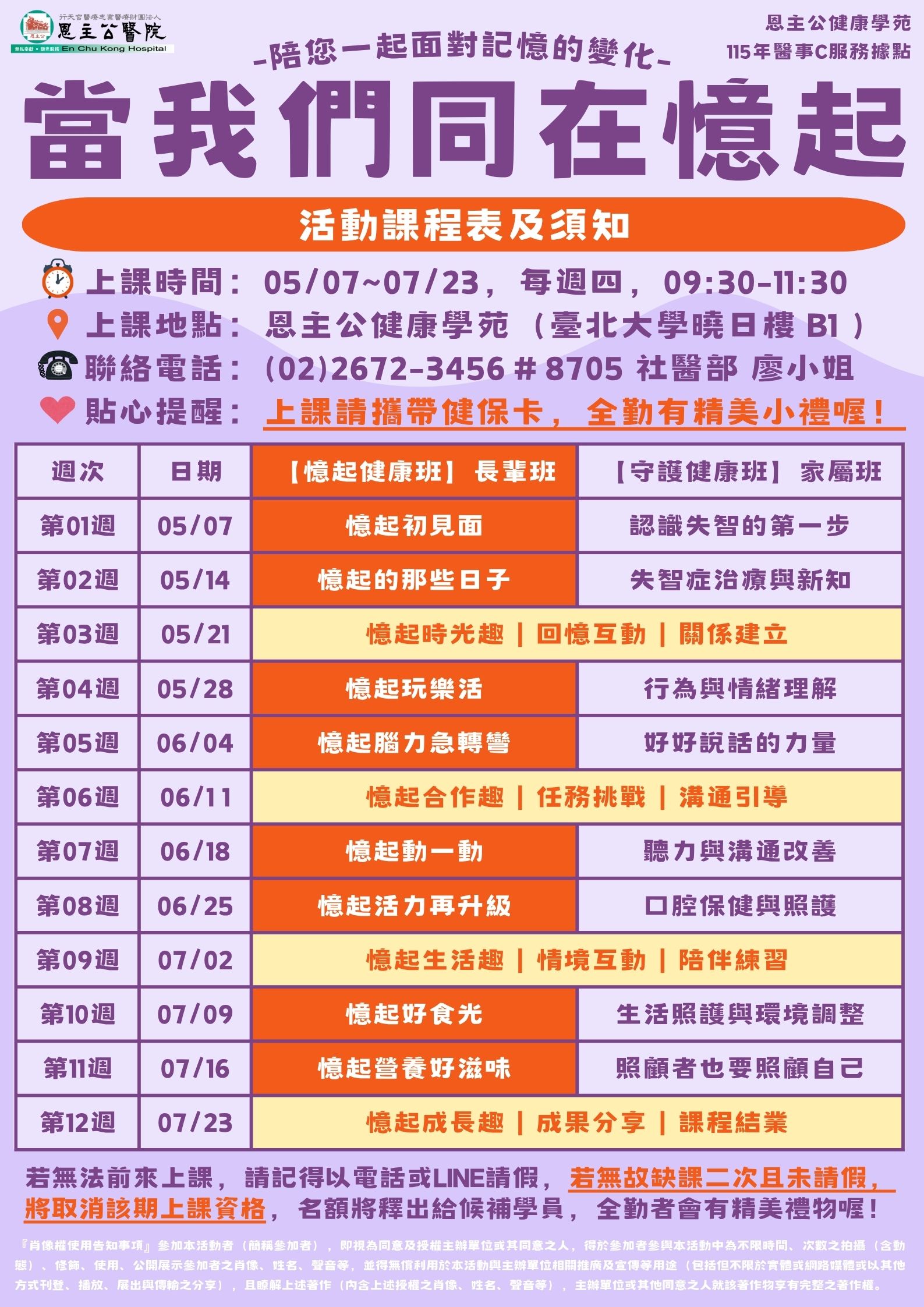 ● 課程時間:115年5月7日~7月23日,每週四,09:30-11:30