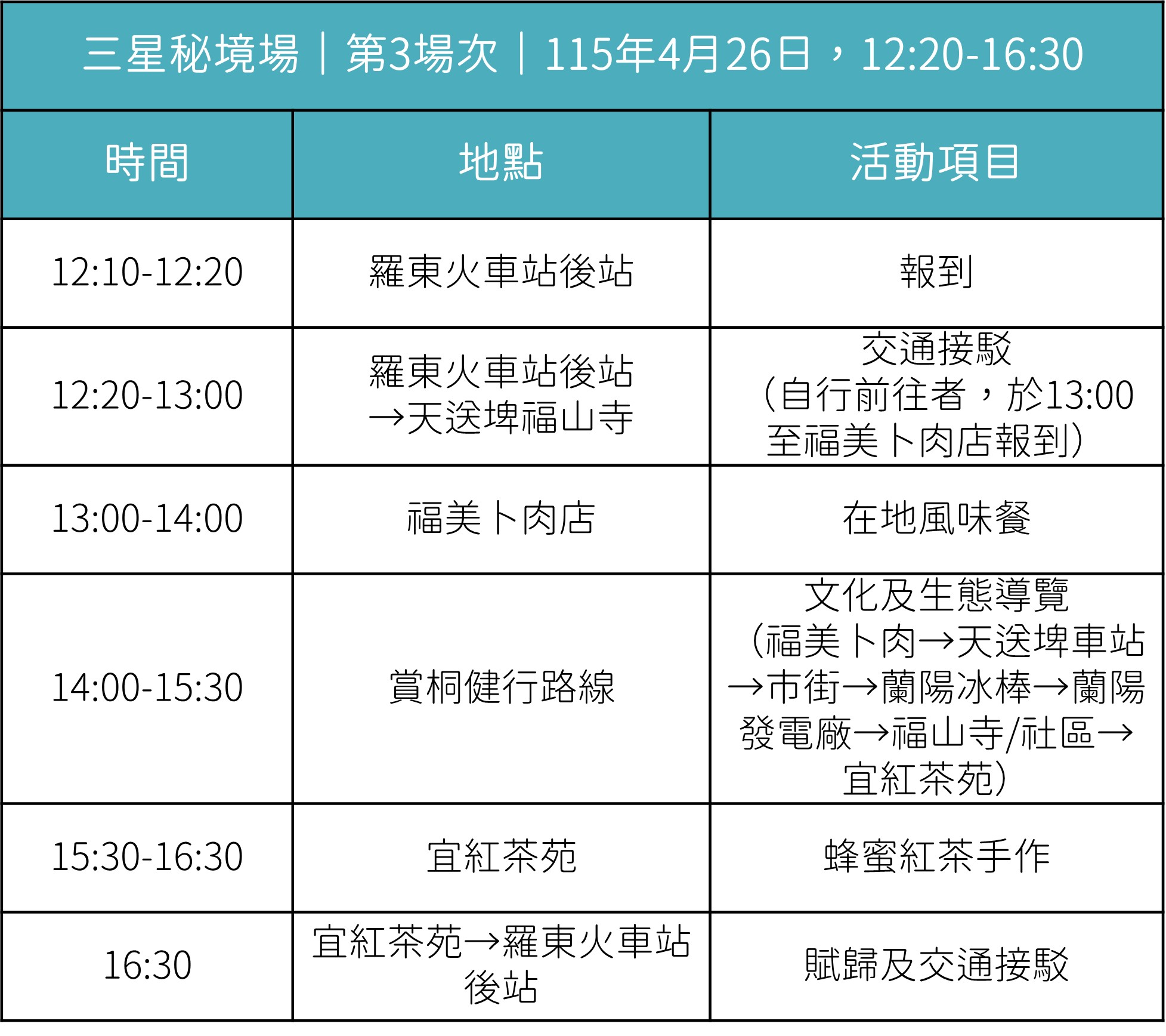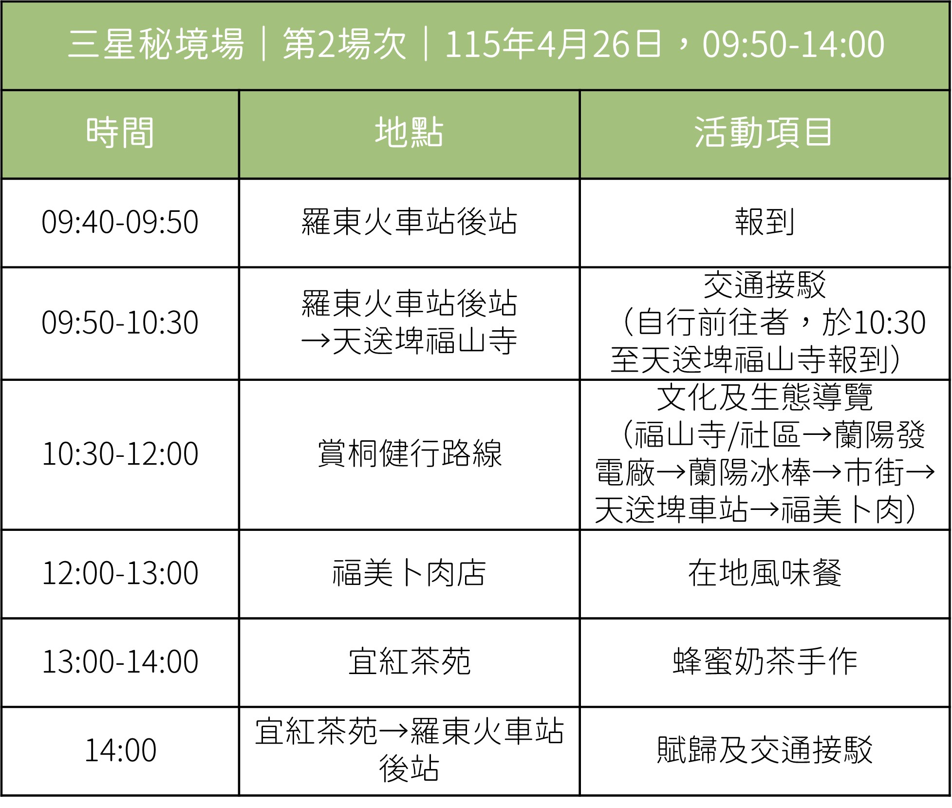 本場次(三星秘境場)提供交通接駁服務,登記接駁者請於準時至【羅東火車站後站】集合,逾時不候。